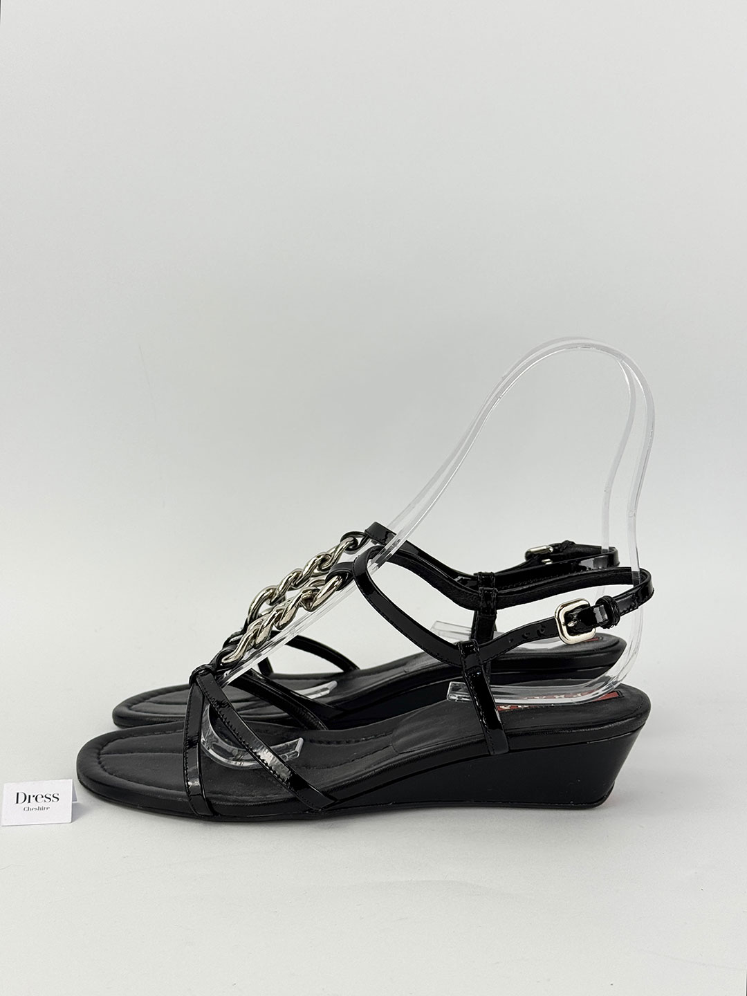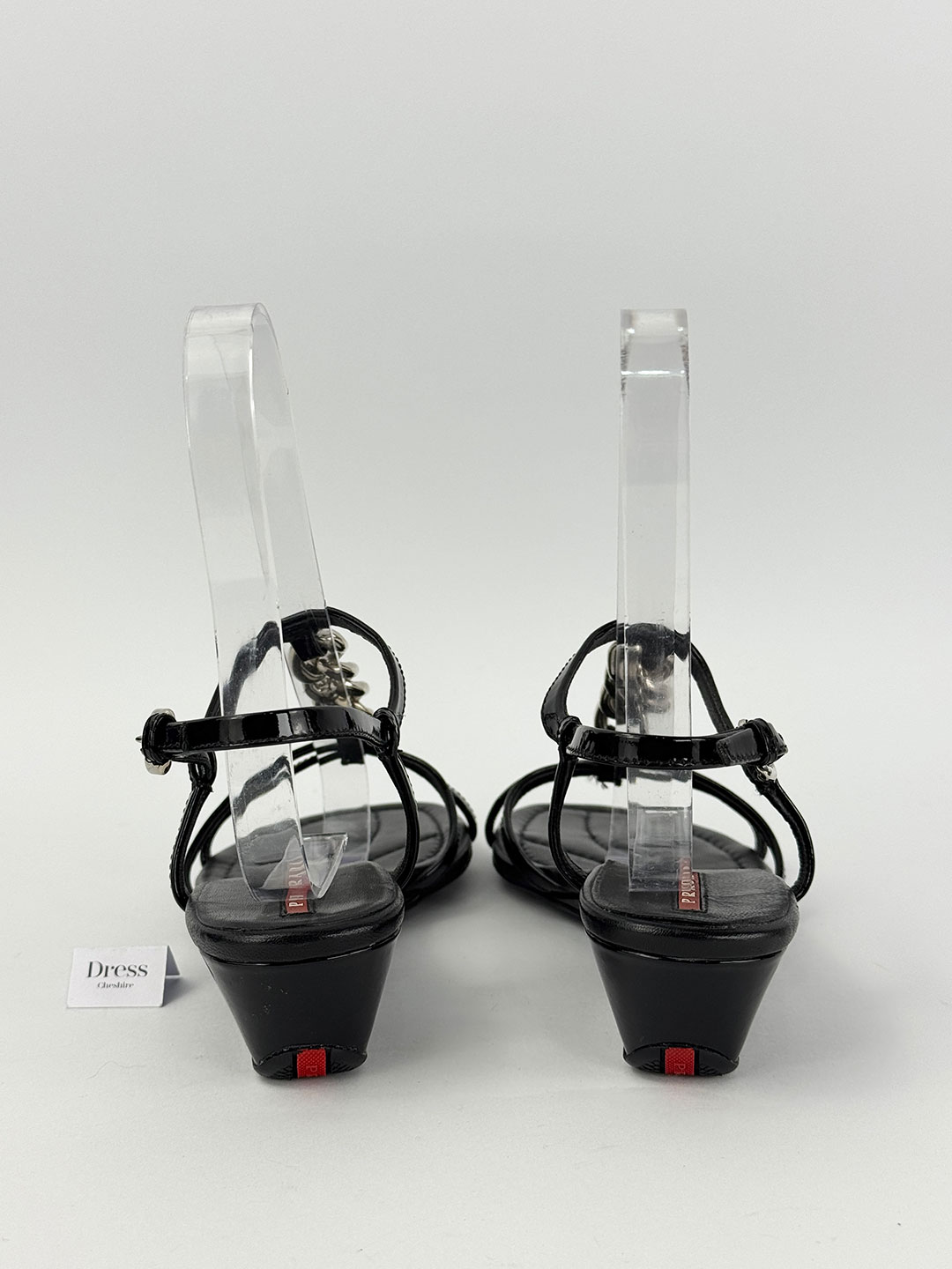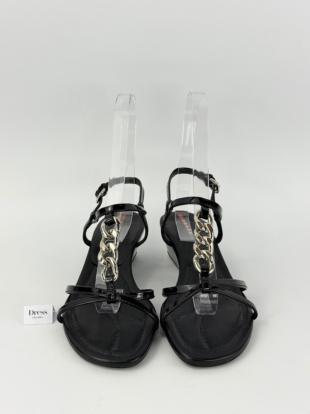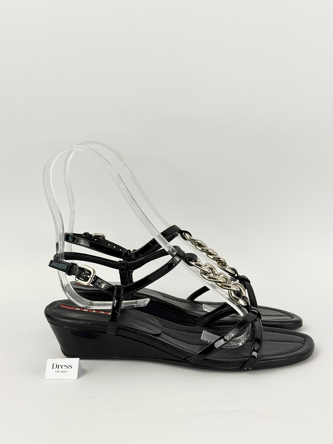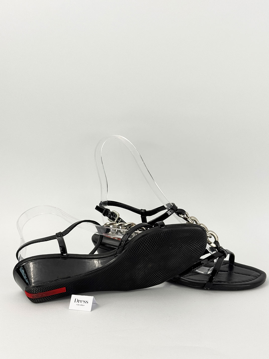 Prada Black Patent Leather Thong Chain Detail Sandals Size EU 37