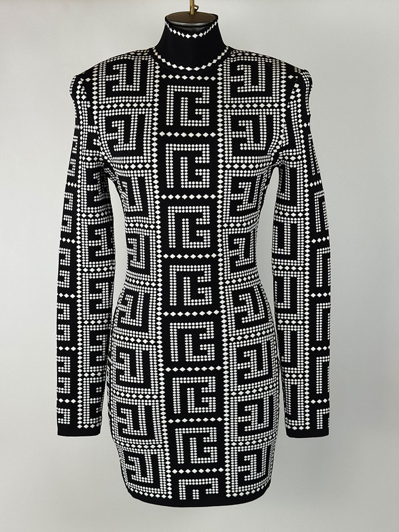 Pre-Owned Balmain Monogram Black And White Dress Size UK 10